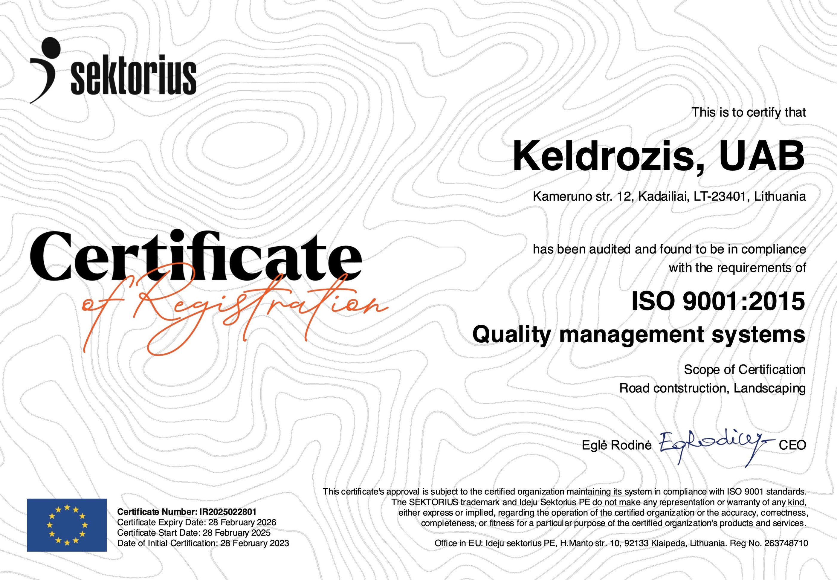 Ši pažyma yra antros šalies, vidaus audito pagrindu, išduotas liudijimas, kuris neprilygsta trečios šalies akredituotos įstaigos išduotam ISO 9001 sertifikatui.